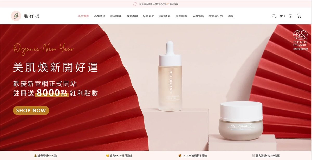 註冊即獲得8,000點紅利點數!此外,還有蛇年開運美肌限定組合,超值組合內含人氣明星有機保養品,讓喜愛有機保養的您以超值價格為自己注入新年運氣與光采,迎接一個充滿活力與新生的蛇年。