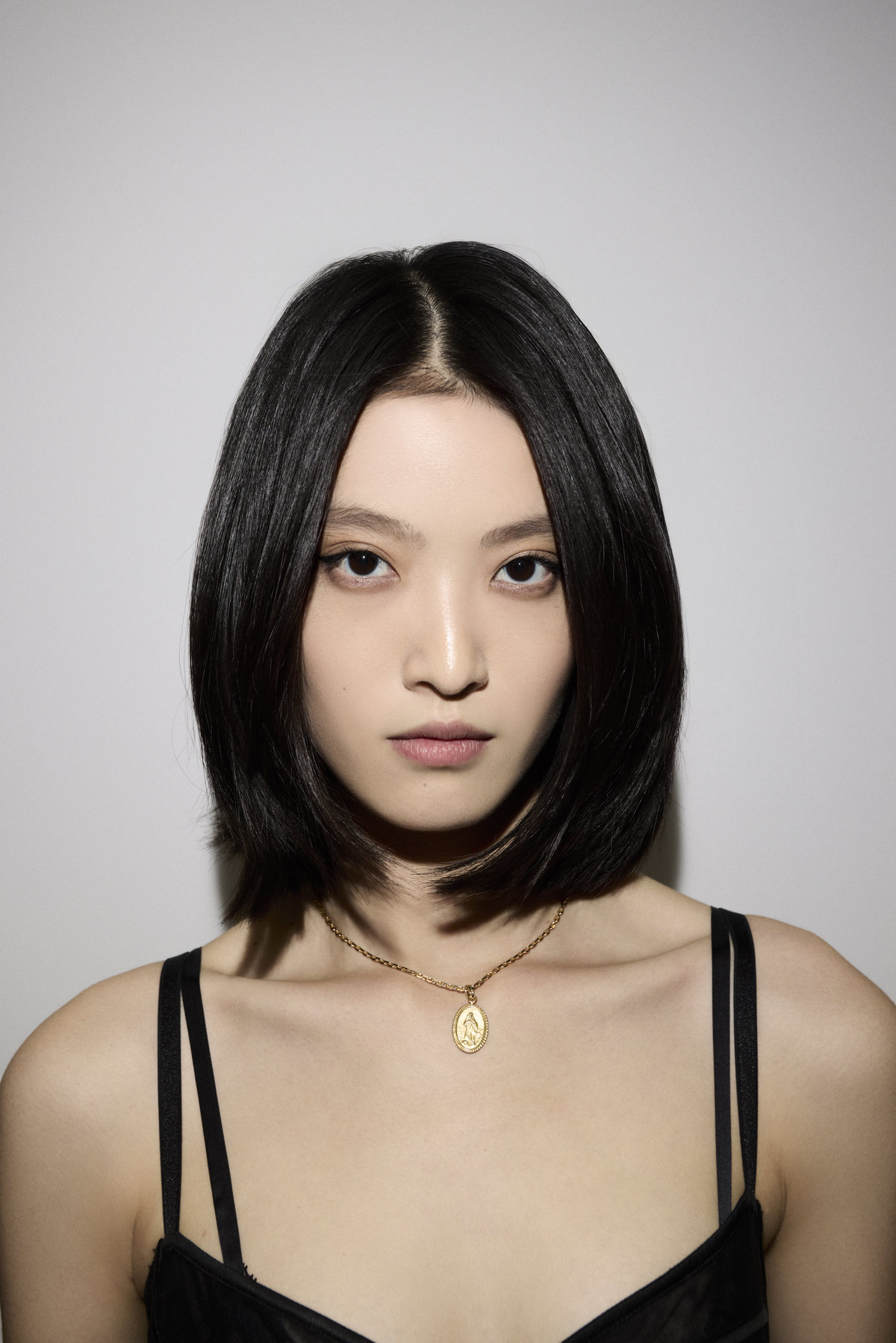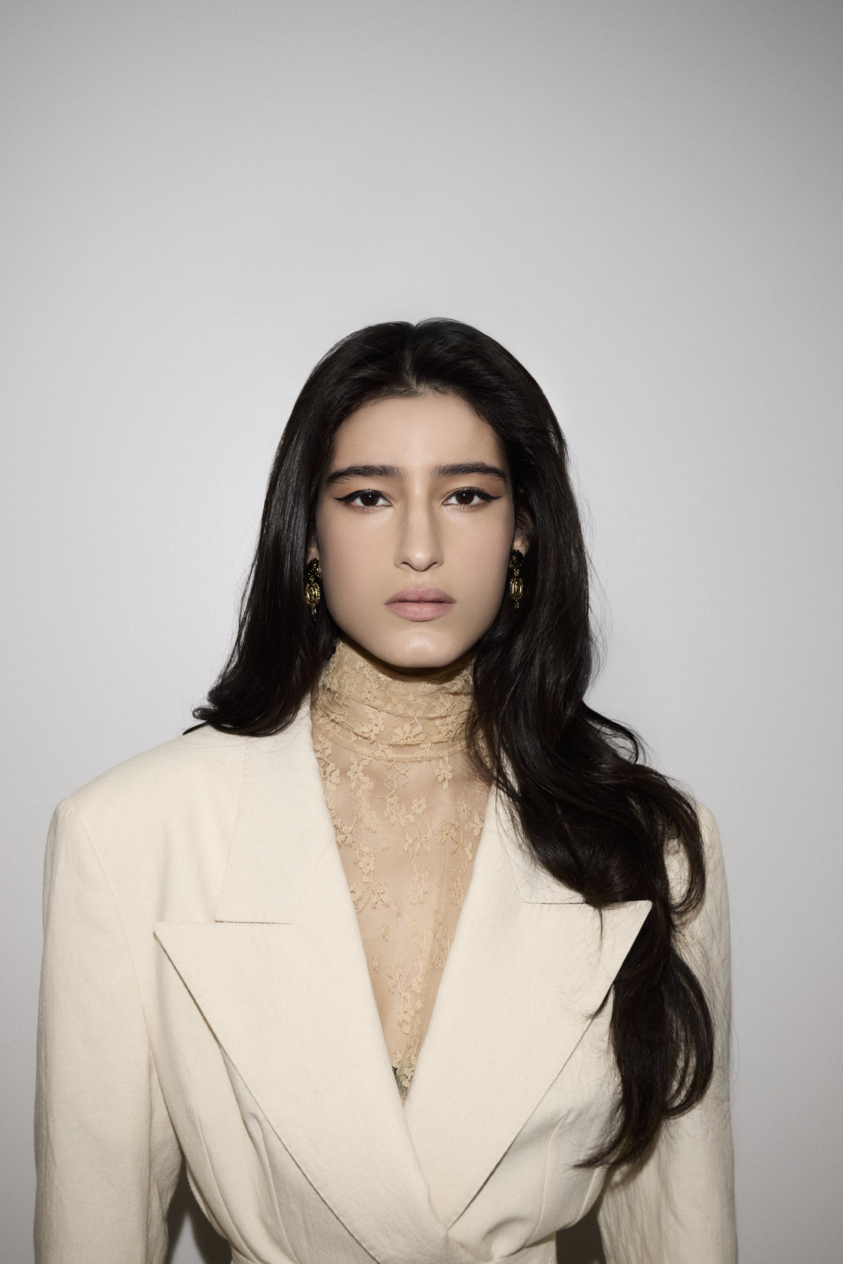 彩妝與服裝相互映襯:無瑕霧面底妝與奢華光澤提亮,平衡睡衣風的慵懶氛圍;俐落眼線與霧面雙唇則點出女性的自信與張力,具對比性的時尚風格。