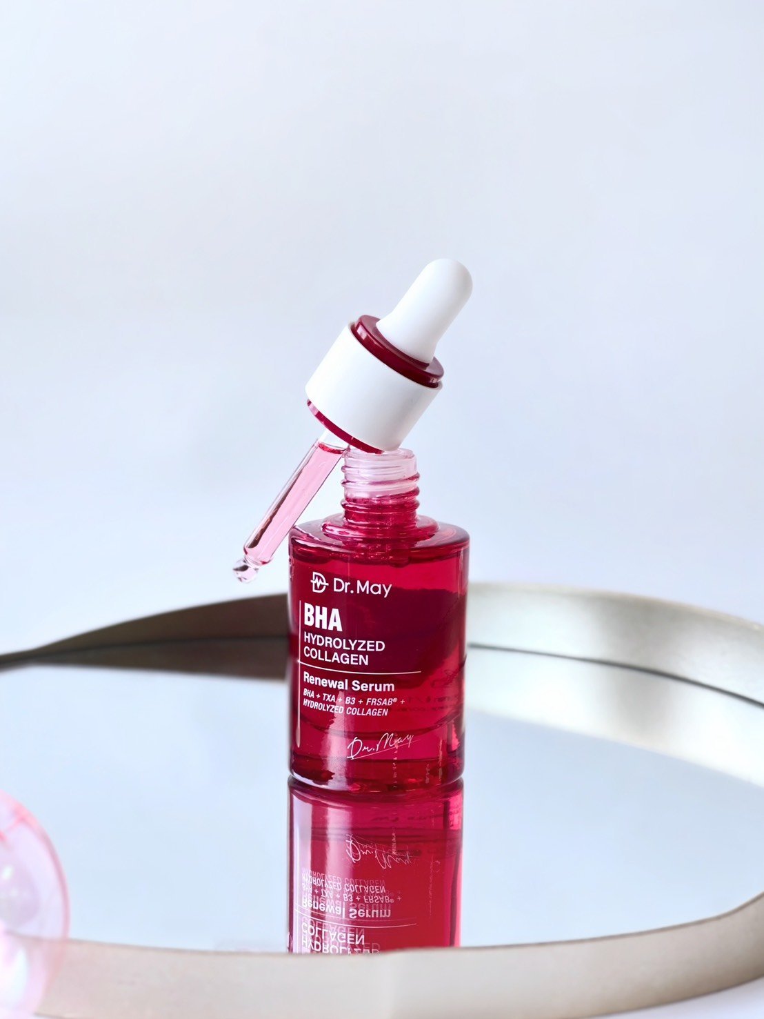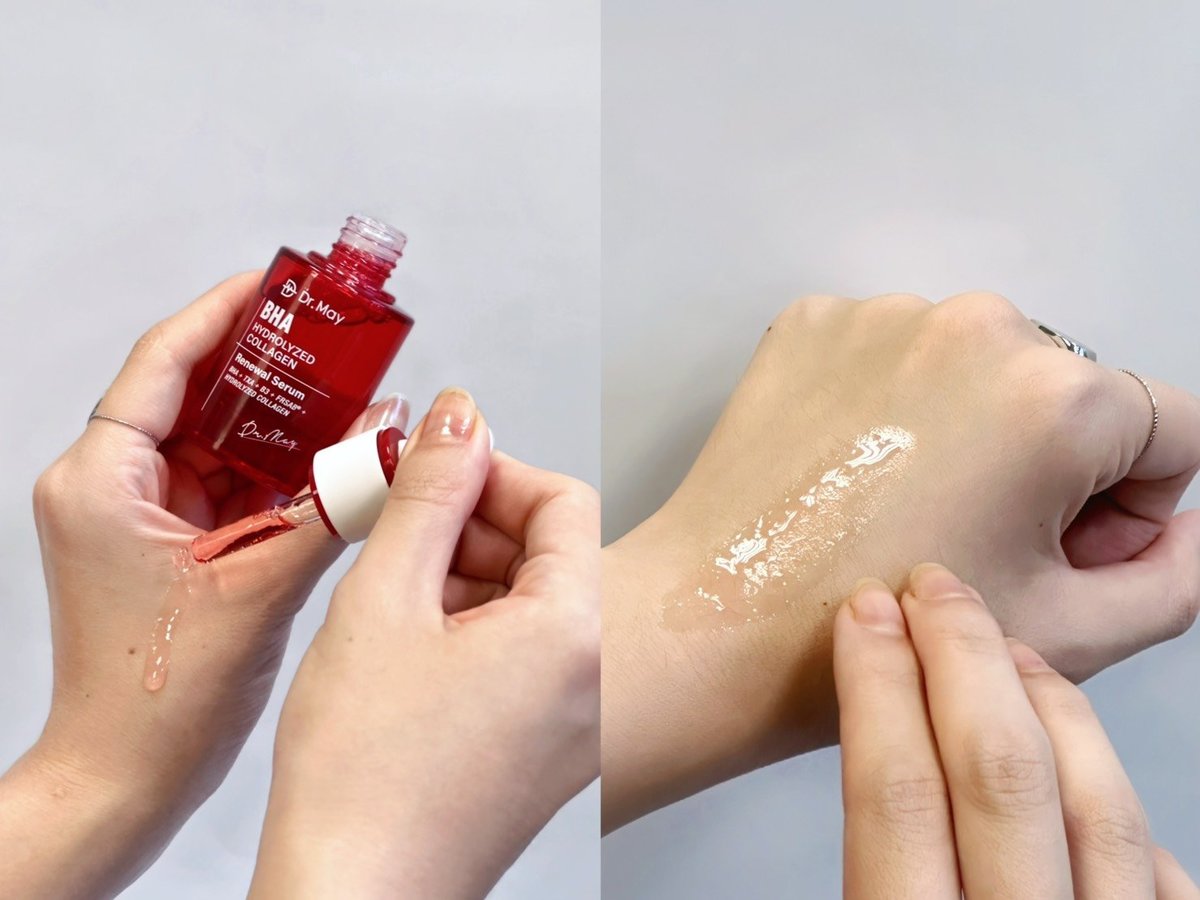 Dr. May 的紅膠原色修煥膚精華中,含有「300億紅外泌* X 300 Da微分子膠原」:核心成分高濃度紅外泌,能夠快速穩定膚況;親膚性高的微分子膠原則用來撐出大家夢寐以求的澎潤感!再搭配 2% BHA 水楊酸和 3% TXA 傳明酸,敞開肌膚通道,讓保養成分直達肌底。而精華中那一抹淡淡的紅色,來自維生素B12,能改善粗糙、打造細緻膚觸,加上獨家科研專利成分「法莎酚」舒緩敏弱膚況,同時勻亮肌膚、改善暗沉。全程「無針無痛」,只要擦一瓶就能抵掉令人痛到厭世的水光課程,絕對是愛美又怕痛的人的福音呀!