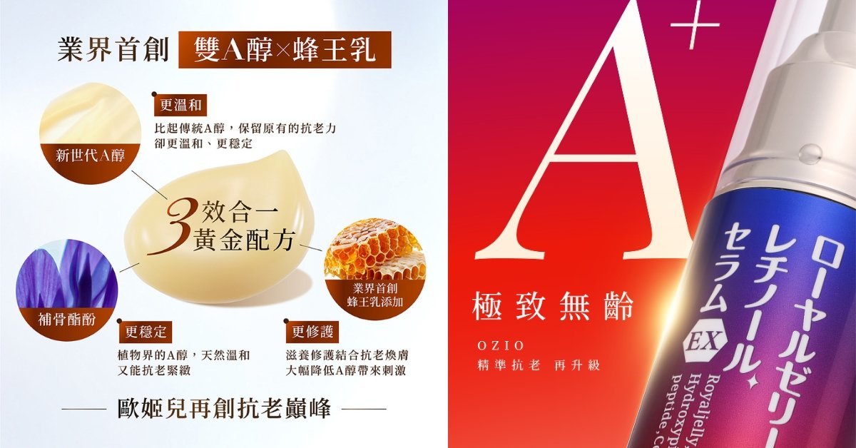 為了讓更多人能安心體驗A醇的高效修護,日本保養品牌 OZIO歐姬兒 以自家明星成分——蜂王乳為基底,研發出全新「蜂王乳A醇緊緻精華EX」,以「溫和 × 穩定」為研發核心,讓初學者也能輕鬆入門抗老保養,一瓶開啟肌膚穩定煥亮之旅。