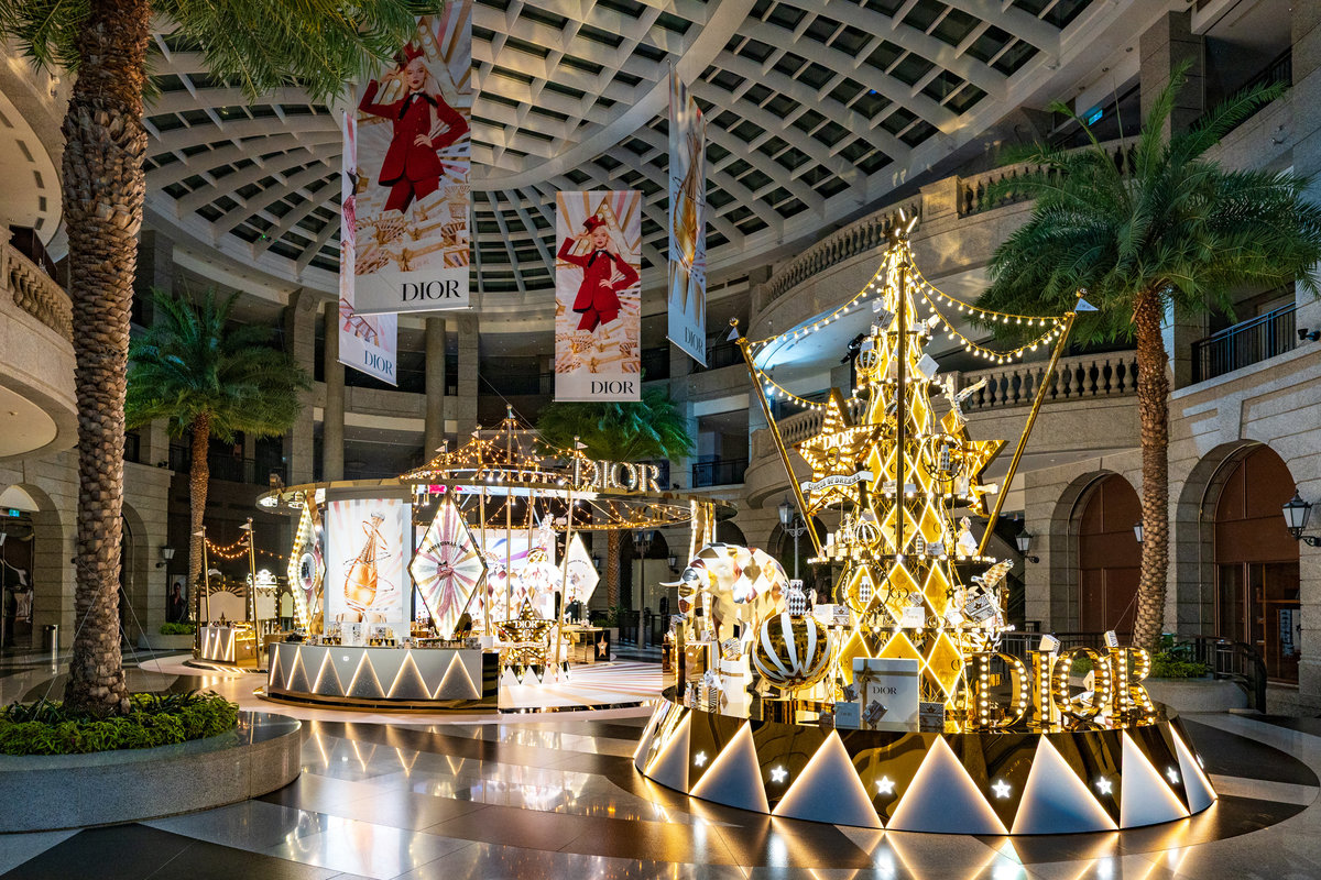 高達 5 公尺的 DIOR「奇幻星願聖誕樹」,以絢麗光影與金色華飾矗立於Bellavita中庭,成為今冬最耀眼的夢幻焦點。樹身綴滿象徵祝福的迪奧幸運星與璀璨吊飾,彷彿點亮節慶夜空。賓客可於聖誕樹前欣賞以金色旋轉木馬構築的奇幻景象,感受 DIOR對細節工藝的詮釋,沉浸於華麗與溫馨交織的聖誕氛圍。