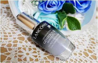 這次要分享的是蘭蔻新品超進化肌因活性安瓶主要成分如下講師說因為此成分比較不穩定所以做成安瓶~使用這款前因換季的關係所以皮膚狀況很不穩定兩頰泛紅嚴重而且有點癢~上妝也非常斑駁剛好來試試這罐的效果淡藍色就是安瓶啦~使用起來觸感比小安瓶在滋潤一些些不過兩者都是清爽的很適